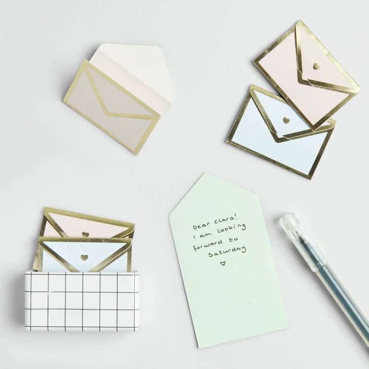 Mini armastuskirjade komplekt „Taevas on piiriks“ sisaldab kaheksat ümbrikku neljas erinevas kujunduses, kaks igast kujundusest, ja sobib ideaalselt väikeste sõnumite või isiklike tervituste saatmiseks. Ümbrikud on valmistatud 180 g/m² paberist, mis annab neile vastupidava ja meeldivalt sileda pinna. Mõõtmed voltimata on 5 × 10 cm ja volditult 5 × 3,5 cm, need on mitmekülgsed ja neid saab kasutada väikeste sõnumite, dekoratiivsete lisandite või loominguliste projektide jaoks.