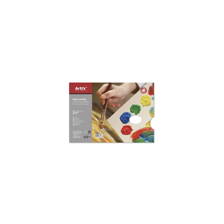 Block of disposable palettes in 60 g/m?2 paper forpaintmixtures. Smooth and soft sheets of paper thatallow you to mix oil, acrylic, watercolor, temperapaints... They are perfect to use when paintingoutdoors and avoid drying the colors on thepalette by taking longer to clean the palette. Withhole to hold it with the thumb more easily. 36sheets.A4 size. Measurements: 210 x 297 cm.