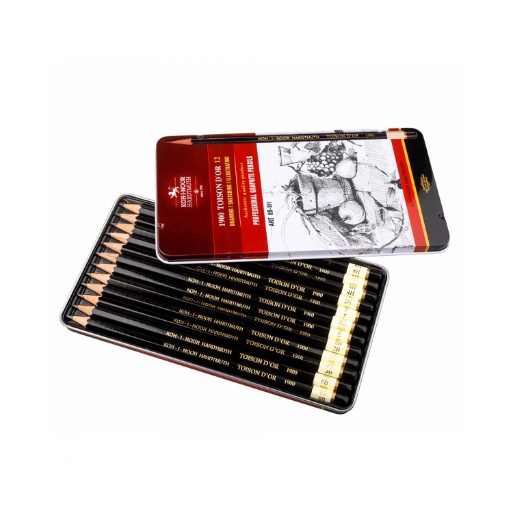 A set of graphite pencils 1902 ART - soft and hard classes. Hexagonal graphite pencils, in black design. Graphite lead in selected 12 classes of hardness 8B - 8H, packaging of 12 pcs in a metal sheet box. The classes are exactly observed. The pencils are used for graphic designers, artists, and technicians.
