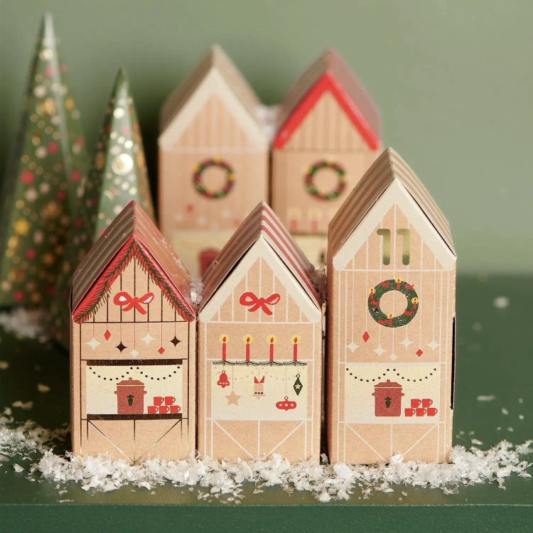 komplekt sisaldab 24 volditavat maja ja kuuse-kujulist karpi, dekoratsiooni-elemnte, 24 numbrikleepsu, kingipaki silte, nööri,