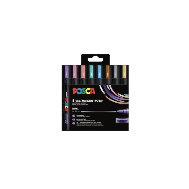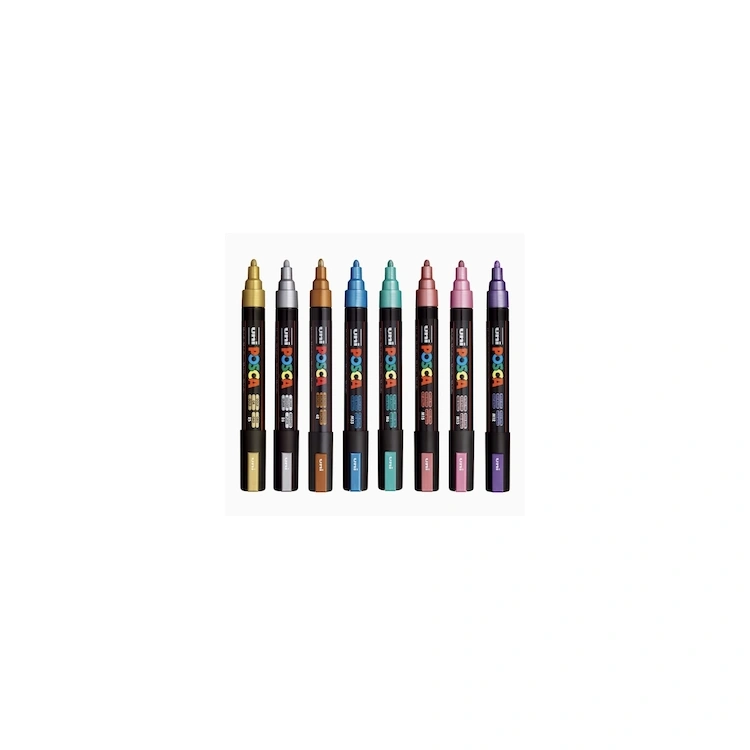 Vee-baasil värvimarkerite komplekt. Toonid- metallikud - lilla, roosa, punane, roheline, sinine, pronks, kuld, hõbe. 5M markeri joone laius 1.8-2.5 mm. Kattev, kiirelt kuivav.