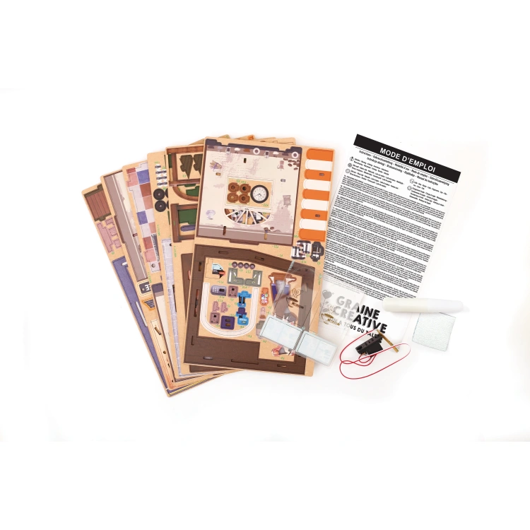 Komplektis MDF plaadist eel-lõigatud osad, liim, ja LED-valgusti.